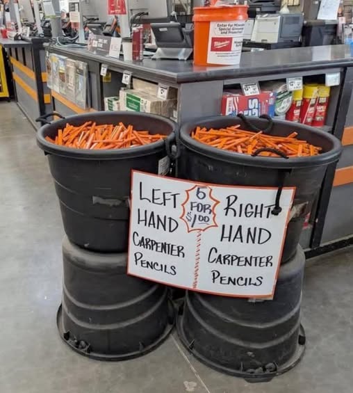 At first glance, it’s just two bins of carpenter pencils. Same price. Same product. But someone added a twist: 👉 “Left Hand” vs. “Right Hand” pencils. There’s no actual difference between them—but now you’ve got a choice. A team. A side. A game. It’s a micro-moment