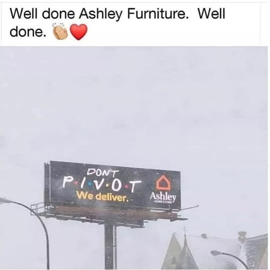 This Ashley Furniture billboard is a masterclass in nostalgia-driven marketing and unexpected creative alignment. The Hook: The sign reads “Don’t P.I.V.O.T. — We deliver.” The word PIVOT instantly recalls the iconic “Friends” episode where Ross, Chandler, and Rachel awkwardly try to move a couch up a